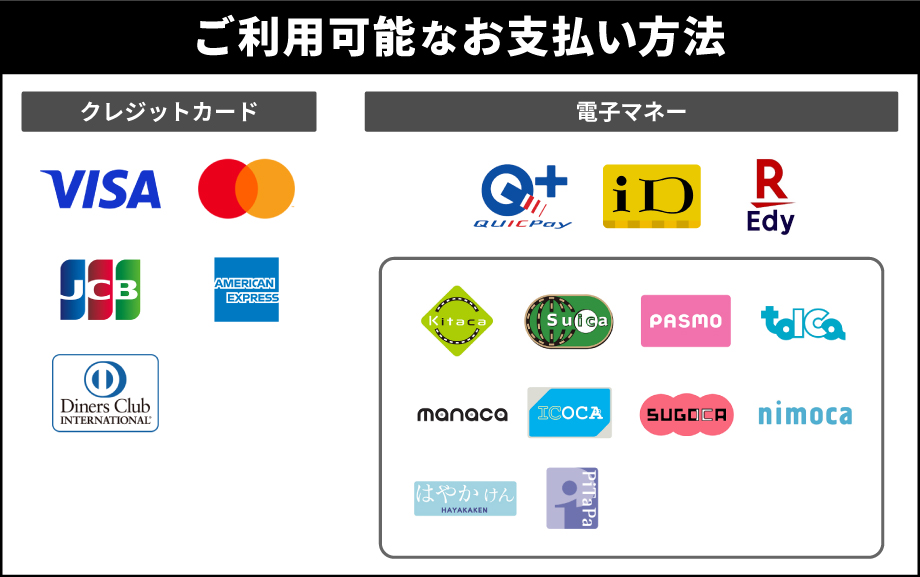 お支払いは現金の他、カード各種、電子マネーも取扱しています!