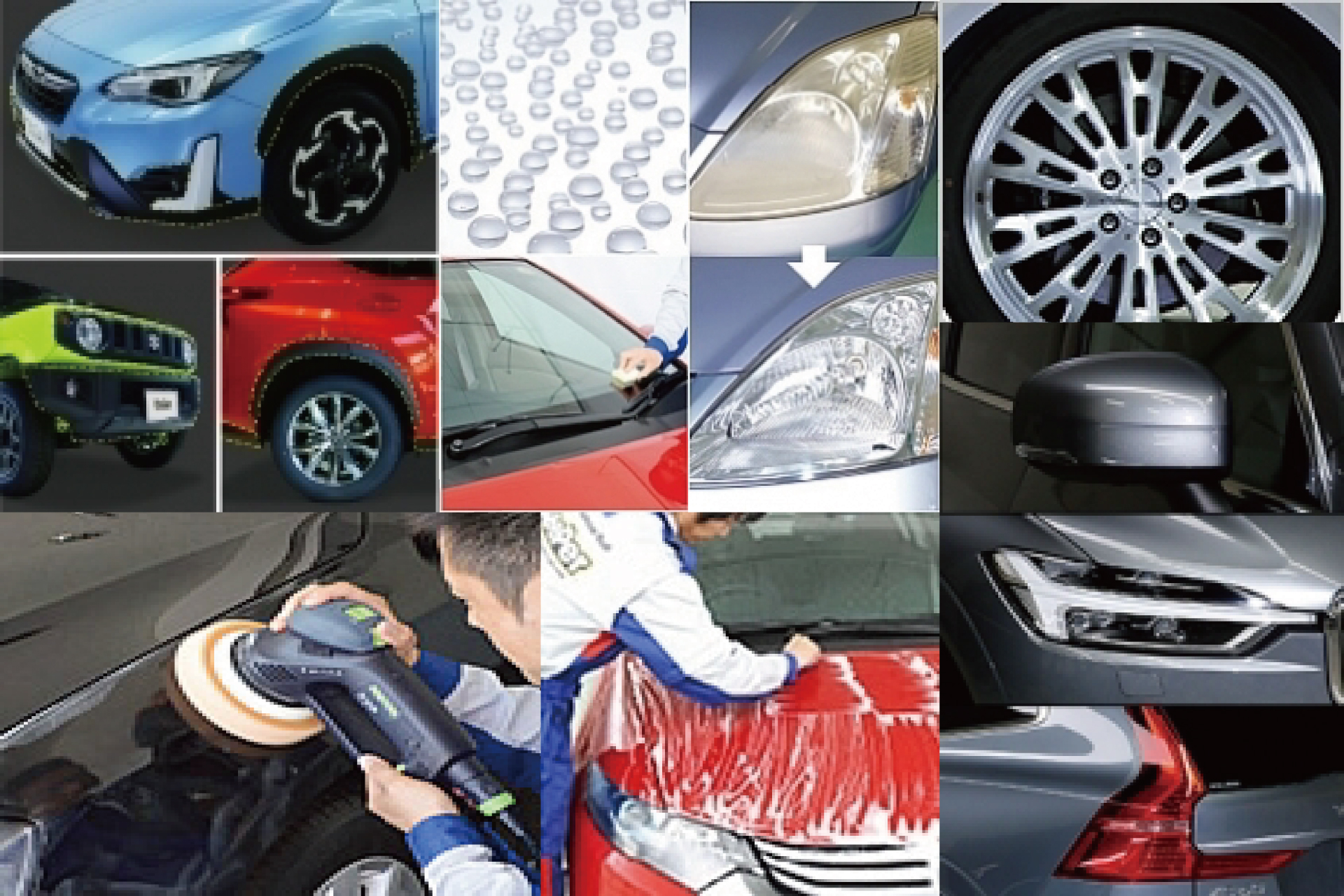 | 施工箇所 | ①窓ガラス全面 ②アルミホイール4本 ③ヘッドライト ④テールレンズ ⑤サイドバイザー(ある場合) ⑥ドア内側のステップ部分 ⑦ボンネット裏側 ⑧トランクの裏側 ⑨給油口の内側 ⑩エンジンルームの中 ⑪除菌車内清掃 ⑫樹脂フェンダーキーパー |